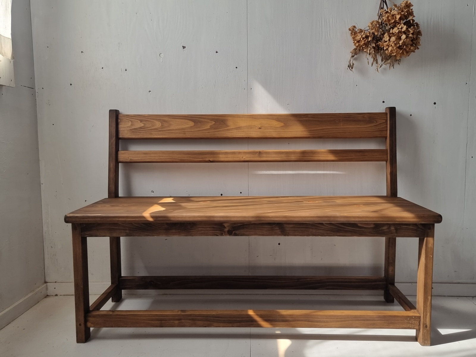 - > 無垢ヒノキで造る 背もたれ付 ベンチチェア h800 w1200 d475 【オスモウォルナット】 セミオーダー品